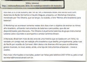 Os WorkShops assumem o papel de difundir e fortalecer a música de matriz africana produzida localmente, permitindo aos participantes, momentos de discussão, trocas e buscas por novas experiências.